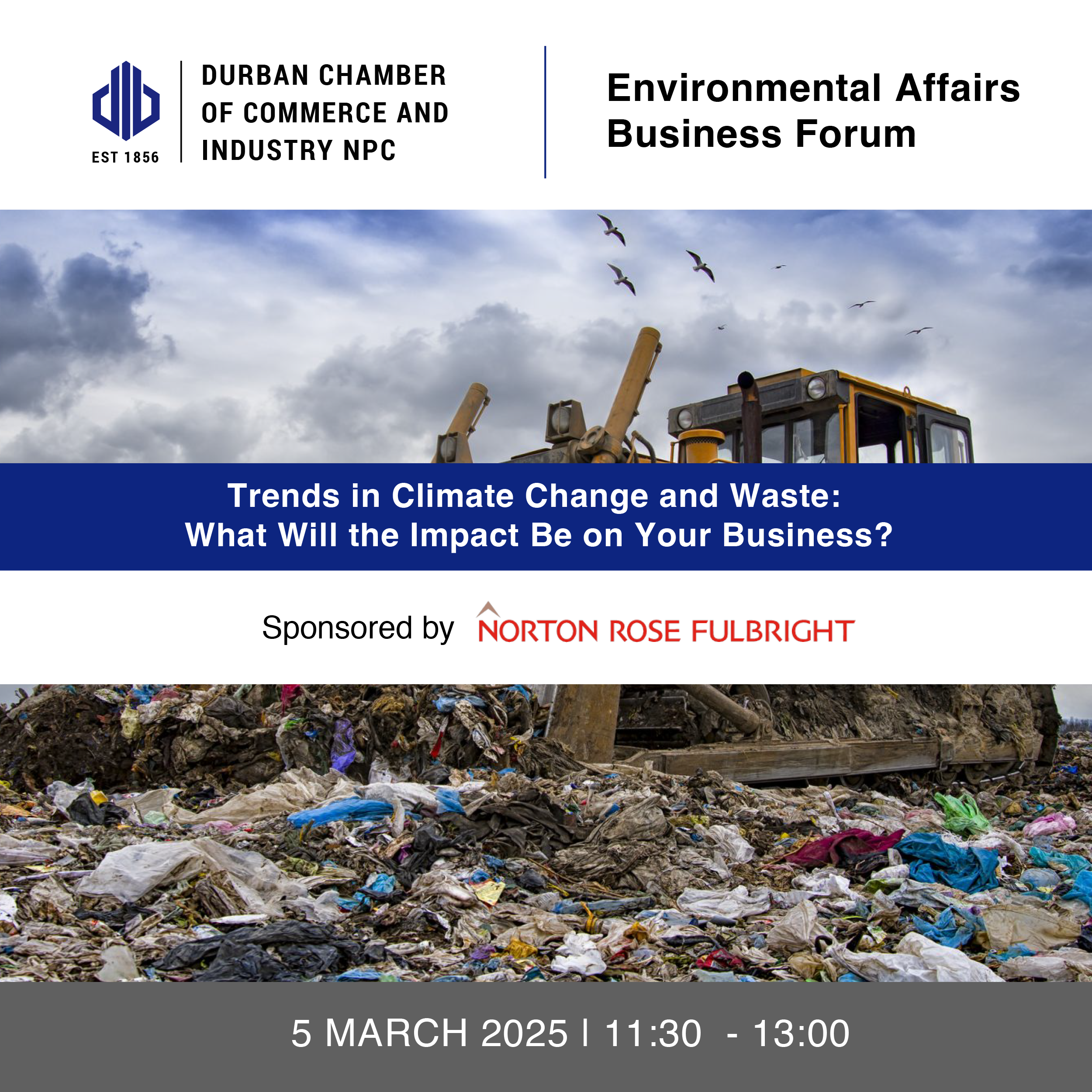 Join the Durban Chamber of Commerce and Industry NPC for its Environmental Affairs Business Forum Meeting on the 5 of March from 11:30-13:00 at Norton Rose Fulbright (3 Pencarrow Crescent, Pencarrow Park, La Lucia Ridge, Durban, 4051).