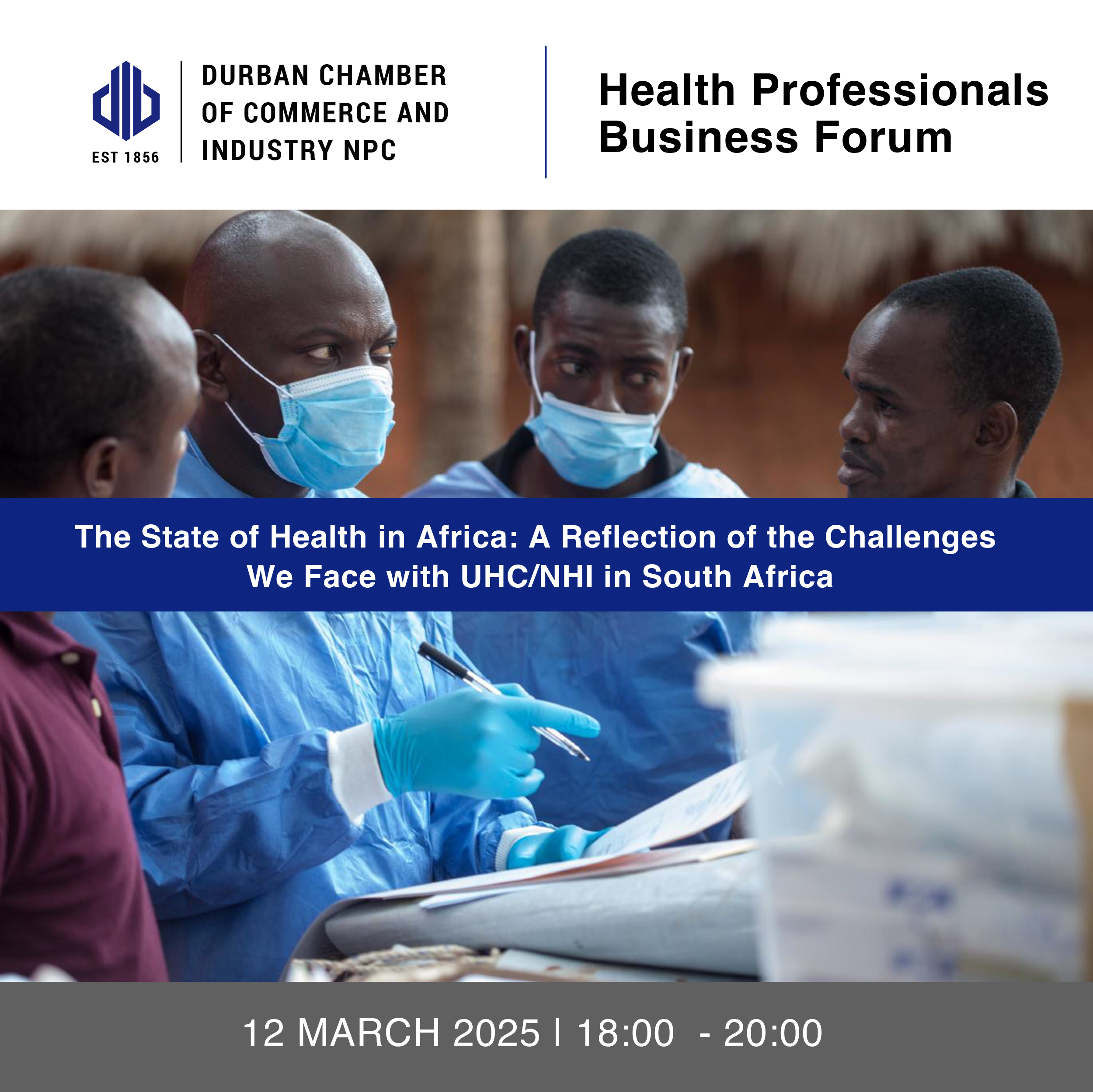 Join the Durban Chamber of Commerce and Industry NPC for its Health Professionals Business Forum Meeting on the 12 of March at Lenmed eThekwini Hospital and Heart Centre , 4th Floor Auditorium from 18:00-20:00.